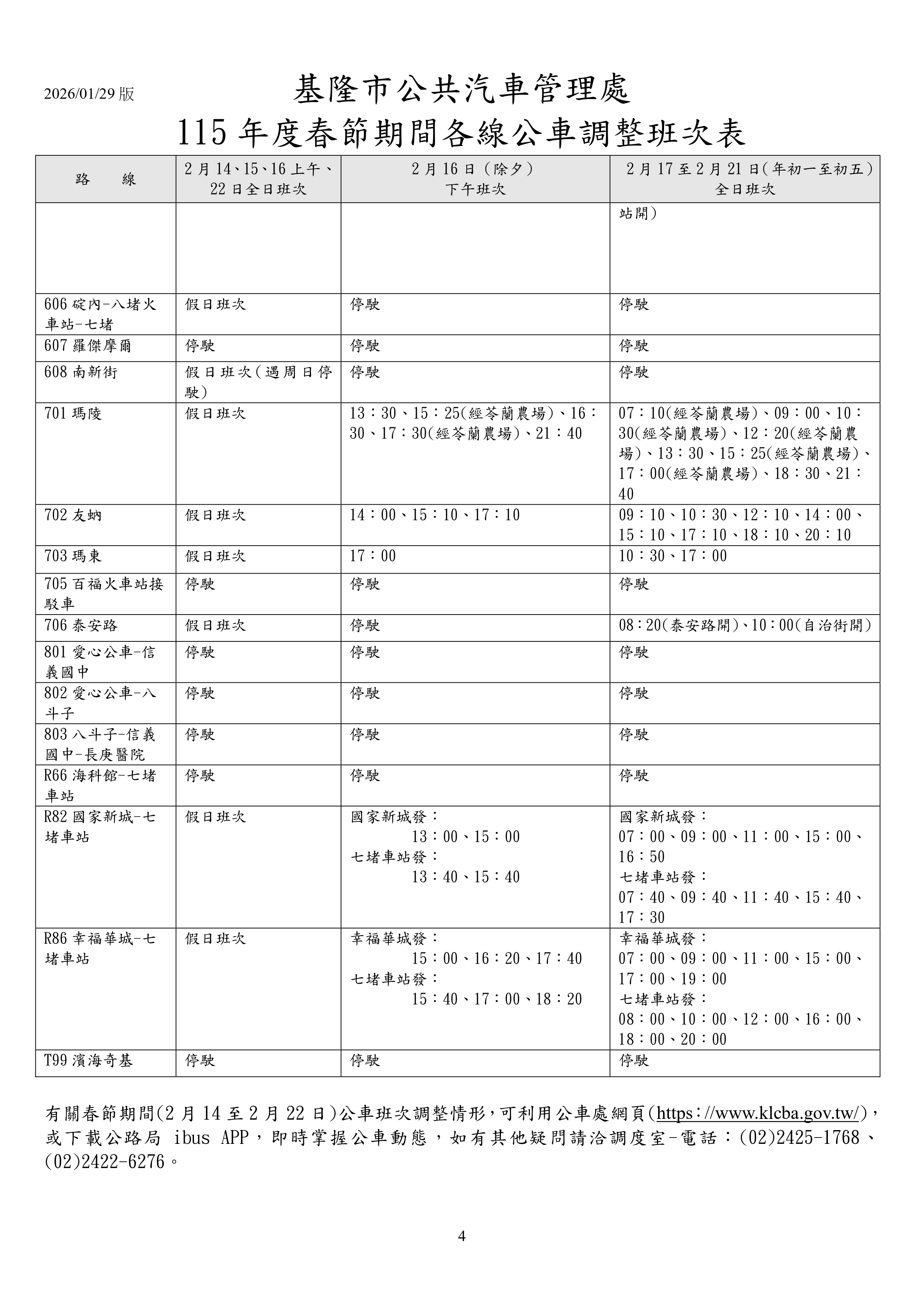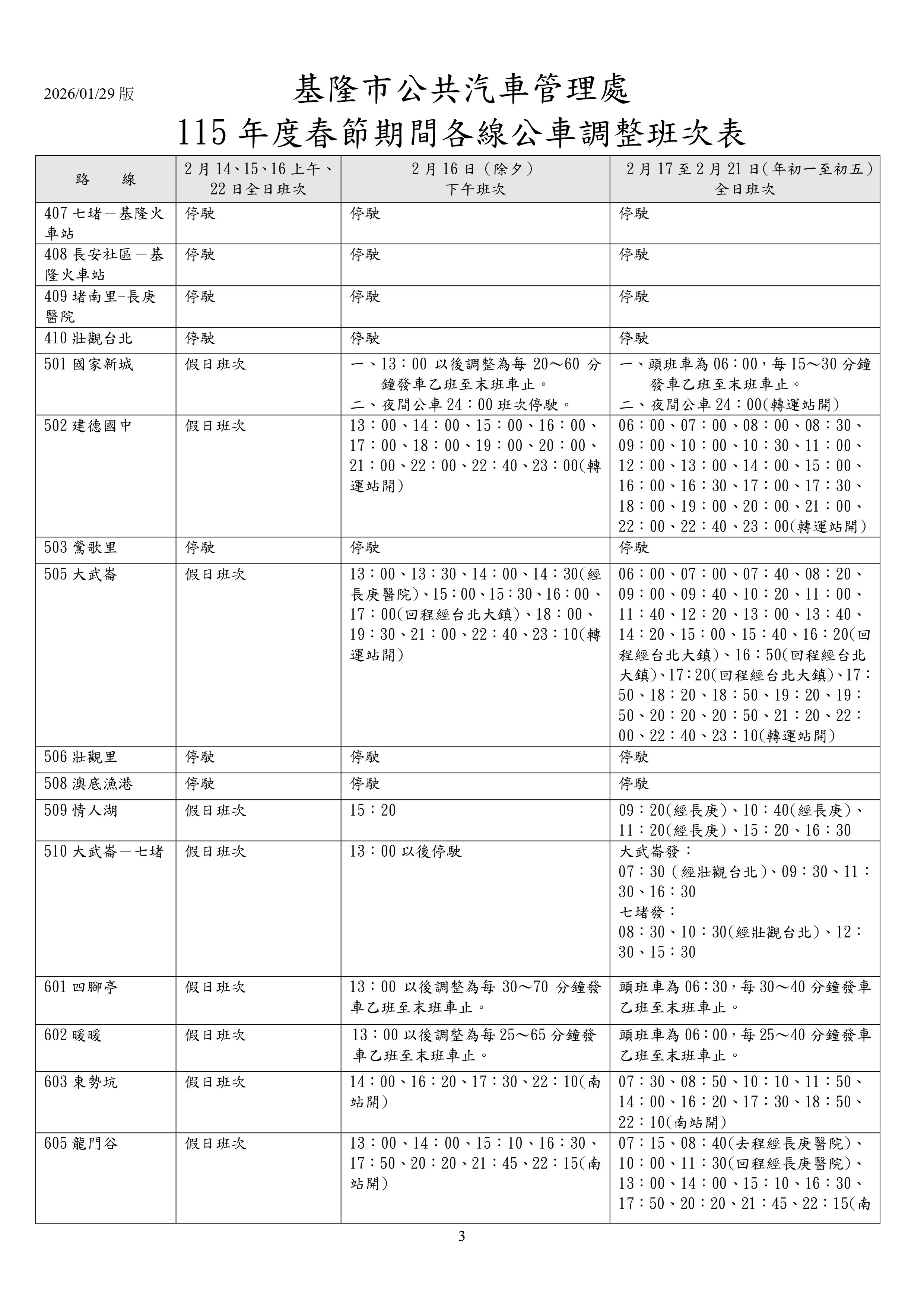 二、本處調整班次詳如附圖「基隆市公共汽車管理處115年度春節期間各線公車調整班次表」。